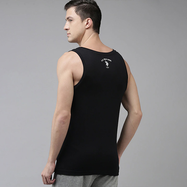 Black & Grey printed gym innerwear vest, has a round neck, sleeveless