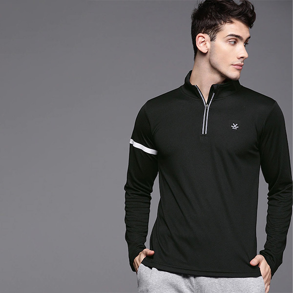 Black self-design T-shirt, has a mock collar, and long sleeves