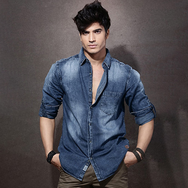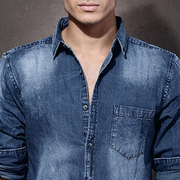 Blue denim washed casual shirt, has a spread collar, a full button placket, long sleeves with roll-up tabs, chest pocket, curved hem The article ages uniquely as you treat it, acquiring your personalised feel.