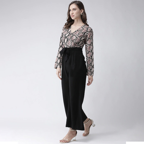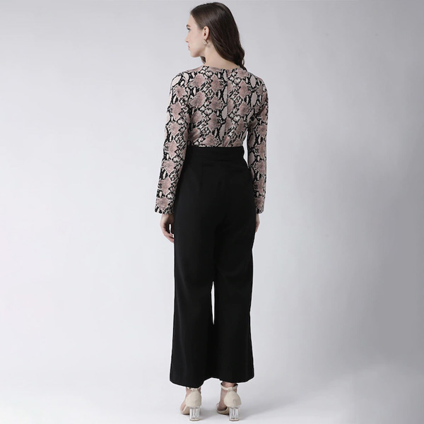 Black printed basic jumpsuit, has a V-neck, long sleeves