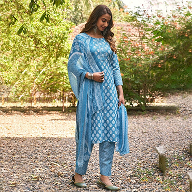 Women Blue & White Printed Unstitched Dress Material