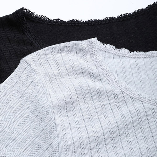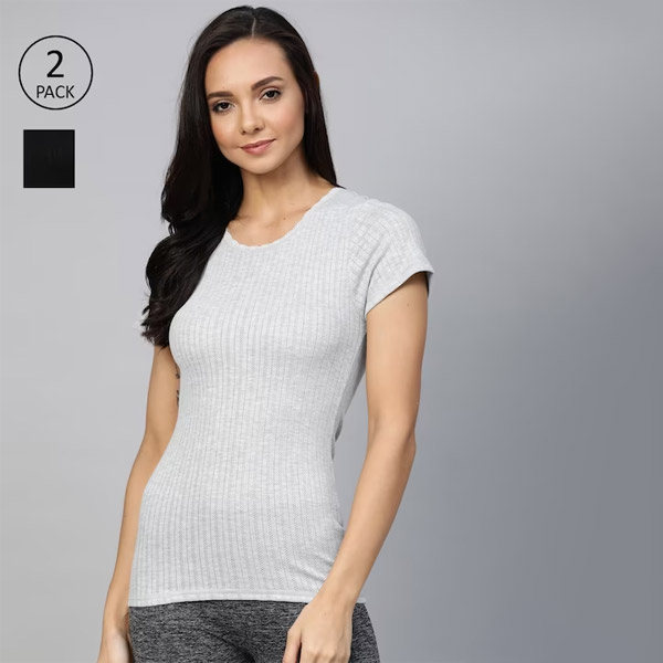 Two self-striped thermal tops in grey melange and black, each has a round neck, short sleeves